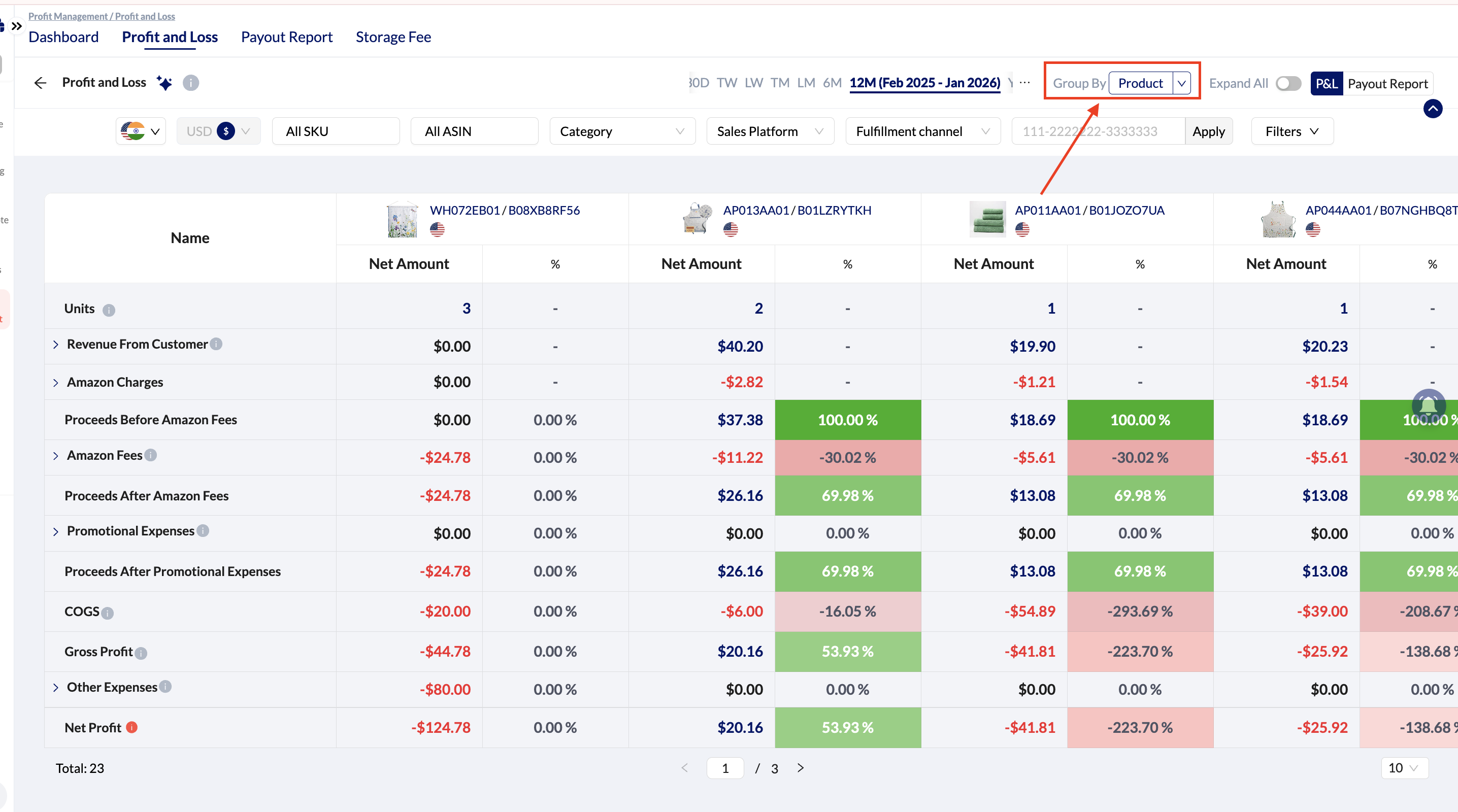 Grouping by product allows sellers to view Profit & Loss metrics separately for each product. This makes it possible to compare profitability across products and identify which products generated profit and which resulted in losses during the selected period.