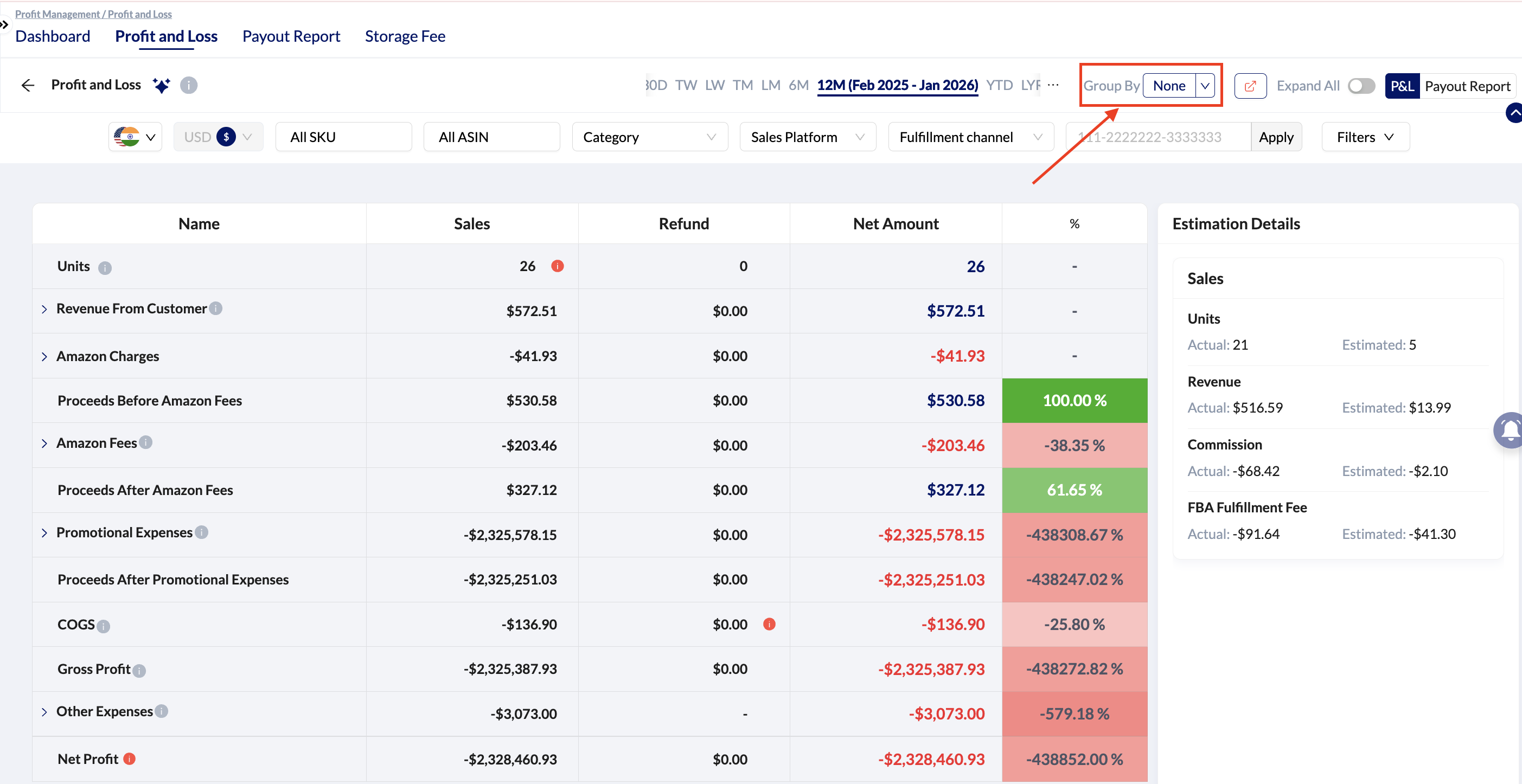 When no grouping is applied in below screenshot the Profit & Loss report shows aggregated totals across all products and dates within the selected period. This view helps sellers understand overall business profitability for the account during that time frame.