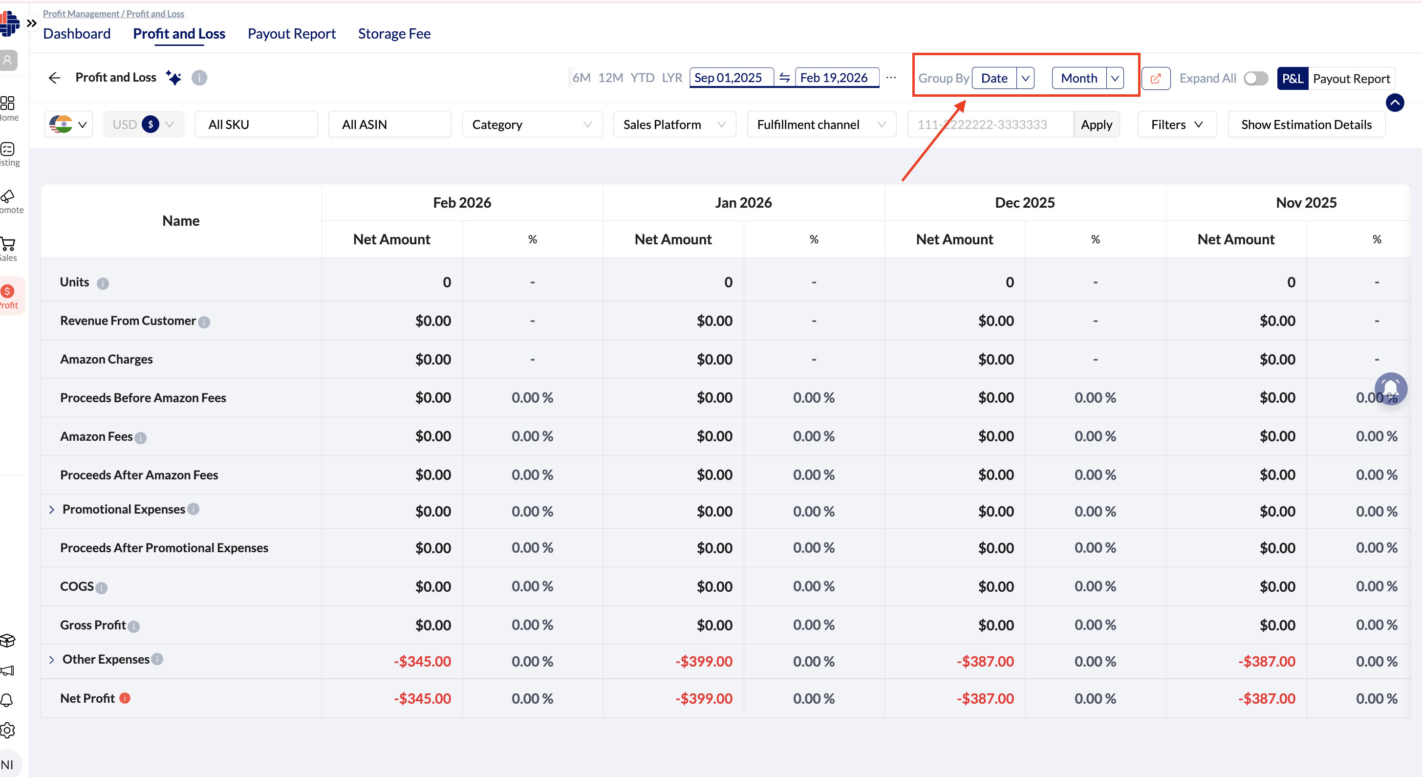 Grouping by date allows sellers to analyze how profitability changed over time. Depending on the selected date range, data can be grouped by day, week, or month. This helps identify profitable and unprofitable periods, trends, and anomalies in historical performance.