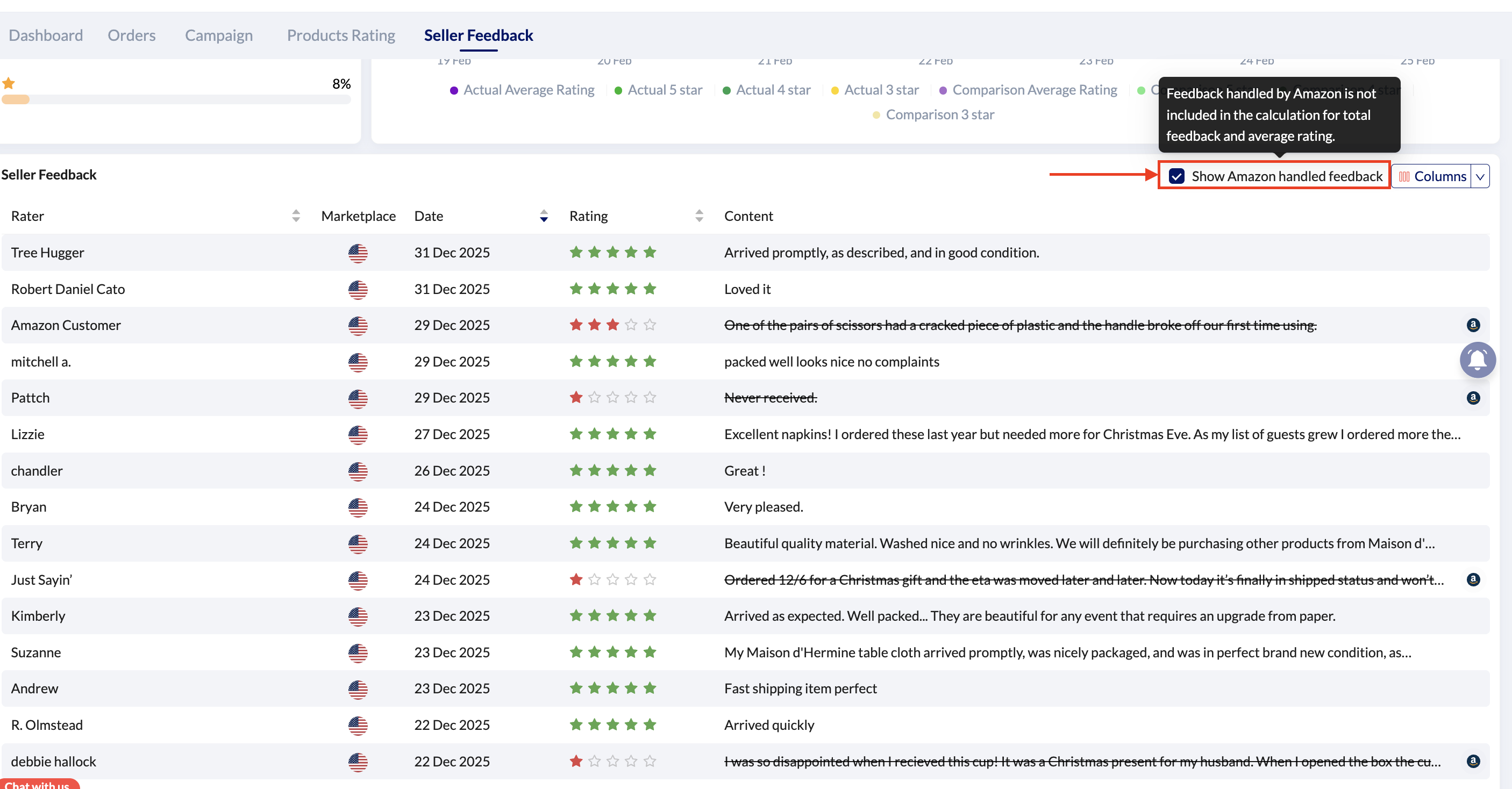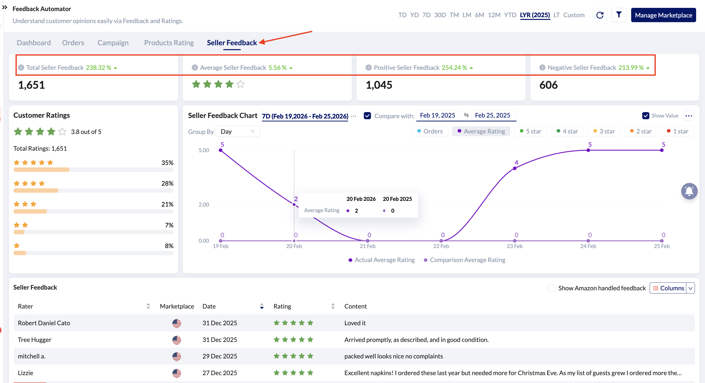 Seller Feedback Tracking provides sellers with structured visibility into seller-level customer feedback across marketplaces. By managing marketplace inclusion, analyzing feedback trends, and understanding Amazon-handled feedback behavior, sellers can protect account health, identify service issues early, and measure the impact of feedback outreach initiatives.