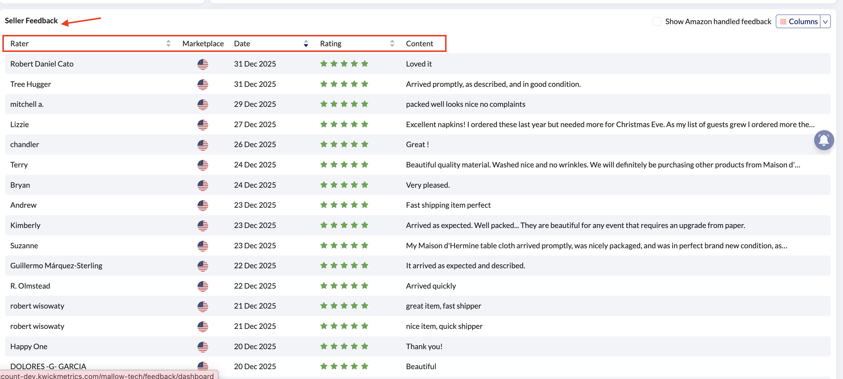 The Seller Feedback Table provides detailed visibility into individual feedback entries.