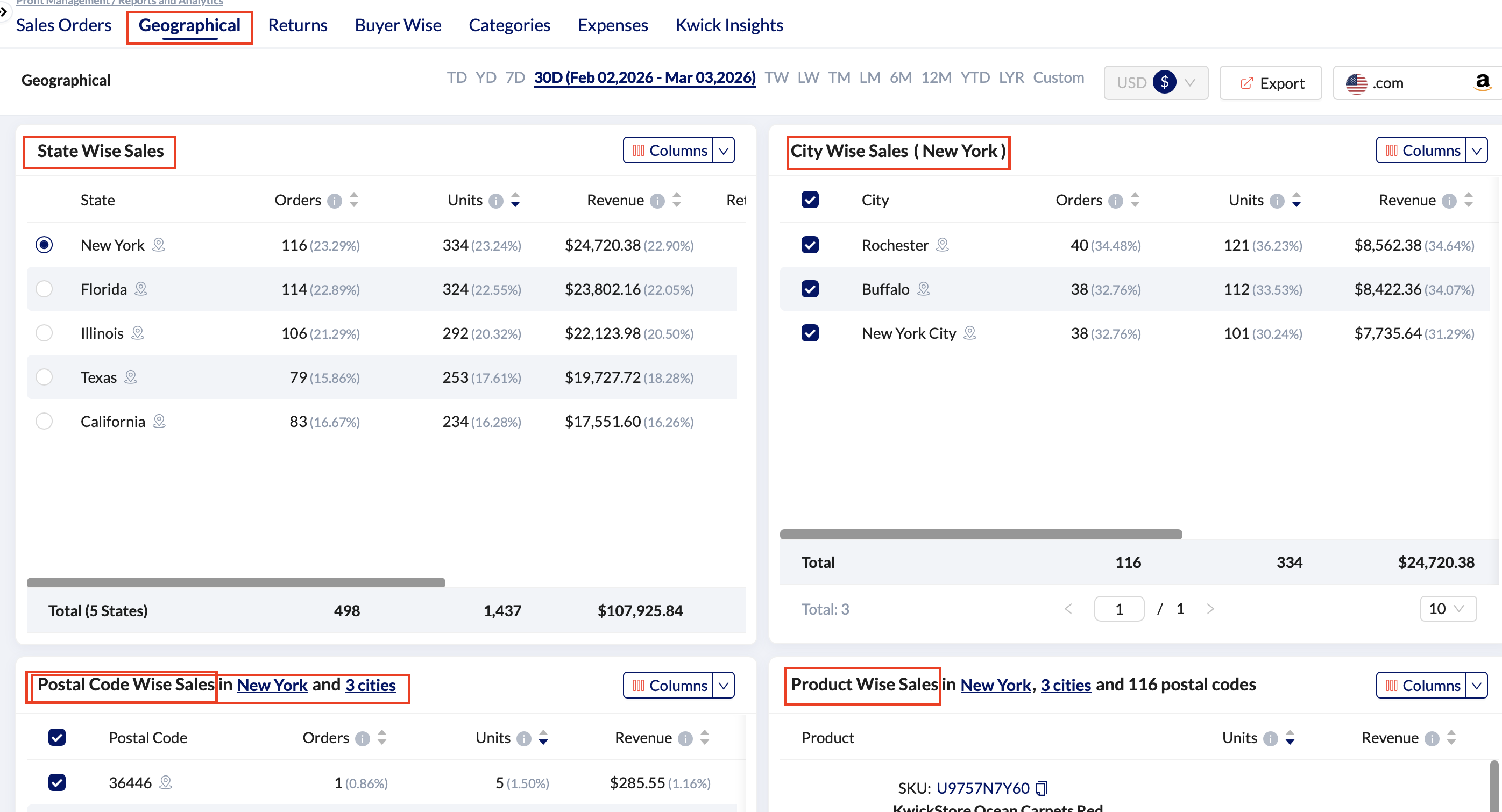 The Geography Report delivers multi-level regional sales analysis from states down to individual products. By combining revenue, demand, and return performance across locations, it helps sellers identify strong markets, detect regional risk patterns, and optimize operational and marketing strategies based on geographic insights.