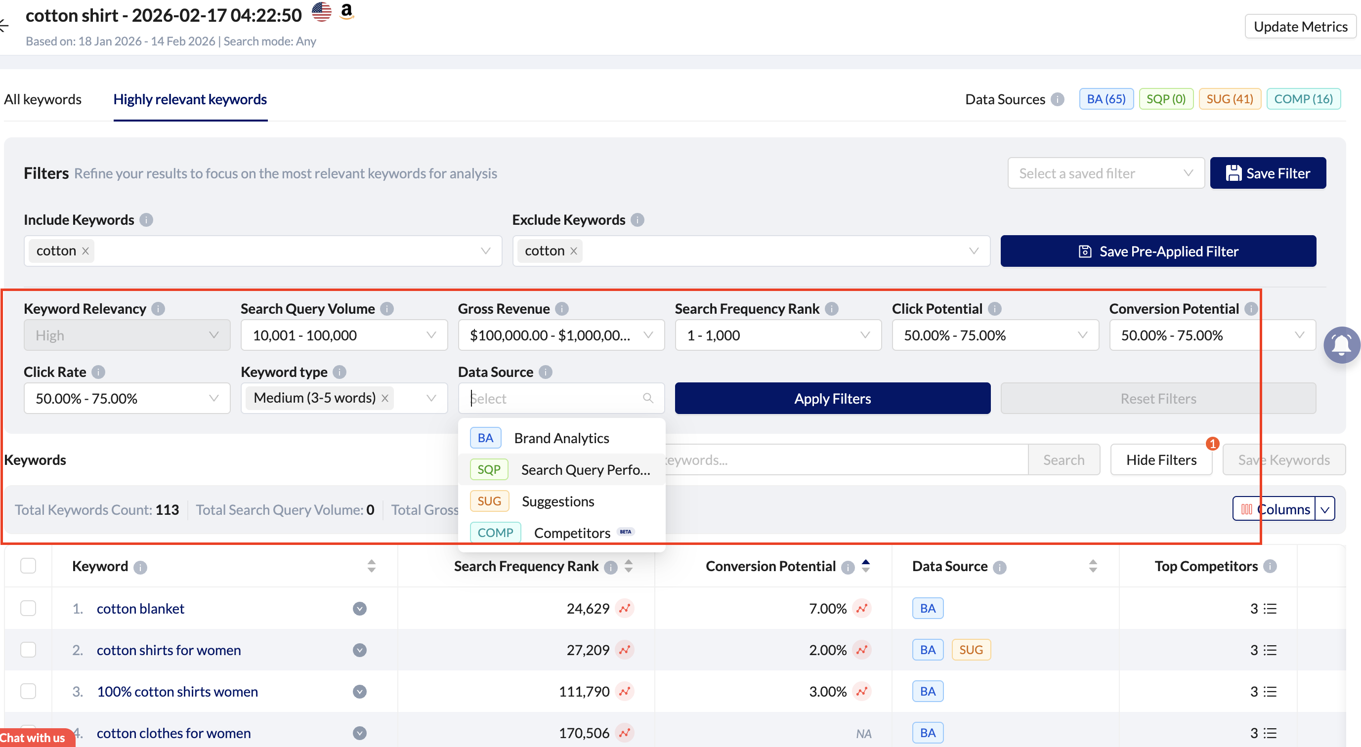 Provides Search Frequency Rank (SFR), indicating relative keyword demand.